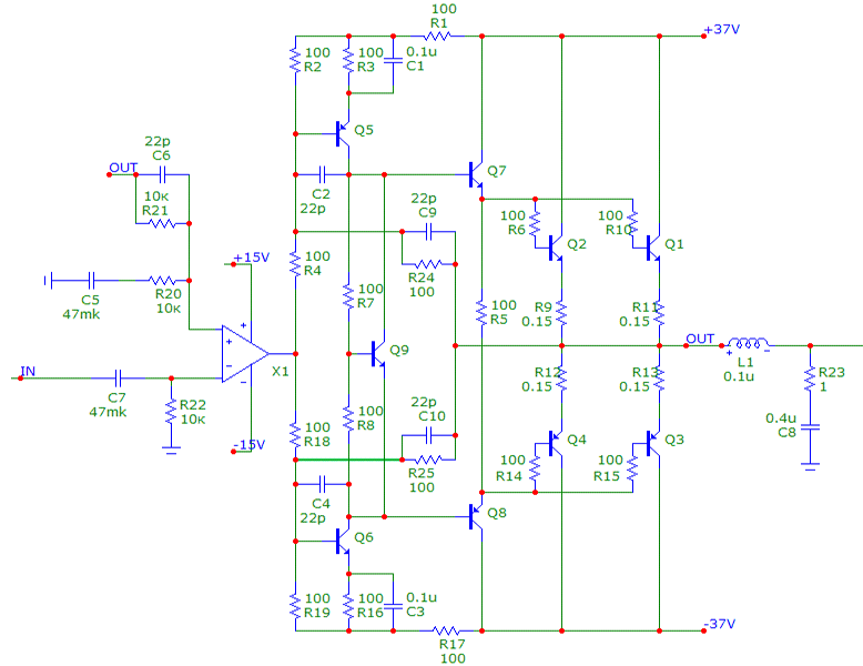 Задача: сделать усилитель для сабвуфера или мидбаса, чтобы был по плечу системе с головой McIntoch. Вот он без рубашки: Вложение 23 Что мы видим. Сразу же бросается в глаза просто огромный сердечник импульсного блока питания. Да, по железу здесь есть запас мощности. Большие банки конденсаторов питания 3300мкф 50В, сдвоенные выходные транзисторы 2SC2987-2SA1227 в правильном корпусе TO-3 и строенные ключи преобразователя дают надежду на хорошие мощностные параметры. Питание выходных каскадов +-37вольт, значит на выходе два по 100 Вт. Ну что, пациент, приходите на обследование… Первое. Несмотря на замечательную схемотехнику преобразователя питания – большой индуктивный фильтр по входу, индуктивную нагрузку выпрямителей на сердечниках из распыленного железа, фильтрацию по входу и выходу, стабилизированное питание, есть значительная (около 200мВ) наводка на выходных клеммах. Второе. Близкий к нулю ток покоя выходных транзисторов. Коэффициент искажений на 1 и 10 ваттах составил около 0,02-0,025%. В спектре преимущественно первые три гармоники, остальные задавлены. Третье и источник всех бед: недоработанная разводка платы. Шины питания преобразователя, входных цепей, обратной связи и силового выхода не разделены и переплетаются в довольно неожиданных местах.:roll: Разбираемся: Начнем с простого – питания. Зашунтировал электролиты по входу и выходу пленочными конденсаторами 3,3мкф и 1мкф соответсвенно. Добавил на вторичку два низкоимпедансных конденсатора 2200мкф 50В. Убрал около 15 ляпов по разводке земли. Продублировал проводами 1,5 квадрата цепи выхода на динамики и массовые провода от динамиков. Преобразователь собран на не очень распространенной микросхеме CA3524. Частота преобразования 25кГц. В схеме есть конденсатор «Мёртвого времени», который не даёт одновременно включаться обоим плечам преобразователя. Это дало возможность безболезненно, без увеличения тока холостого хода, поднять частоту до 40кГц, повысив номинальную мощность преобразователя в полтора раза. Для басового усилителя это очень немаловажный фактор. Следующее – выходной усилитель мощности. Схема, нарисованная по плате (реверс инжиниринг) дала нам выходной каскад с усилением напряжения: Вложение 31 Причём левый канал неинвертирующий, а правый инвертирующий. Простое объединение входов превращает усилитель в мостовой. Насчёт схемотехники потом, а здесь я подобрал выходные транзисторы в пары по коэффициенту усиления и напряжению база-эмиттер, заменил электролит обратной связи на низкоимпедансный и зашунтировал питание операционника керамикой. Подбор тока покоя будет на этапе отладки. Входные цепи. Вполне разумное построение: Входная цепь регулировки чувствительности и параллельно три цепи трёх режимов работы: flat, LP, HP. Заменил все конденсаторы в цепи flat. Что можно – на плёнку, что нельзя - на низкоимпедансные емкости HITANO. Весь усилитель построен на операционниках C4570HA, на которых честно написано “Made in China”. Но, посмотрев на них даташит, я увидел, что это отличные операционники не хуже NE5532 и замены абсолютно не требуют. В цепях питания также на каждый операционник повесил керамику. Вот вид переделанного: Вложение 30 Теперь посмотрим, что у нас получилось: Радует значительное снижение уровня наводок от преобразователя – в пять раз, до 40-50мВ. Абсолютно низкие искажения усилителя – 0,012% на любо
