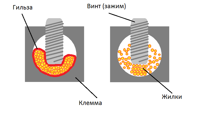 При использовании этих элементарных штучек значительно увеличивается пятно контакта провода с клеммой, и жилки остаются целыми. При этом многожильный кабель становится типа цельным , снизу нарисовал для наглядности http://autozvuk.org/forum2/attachmen...1&d=1289773787