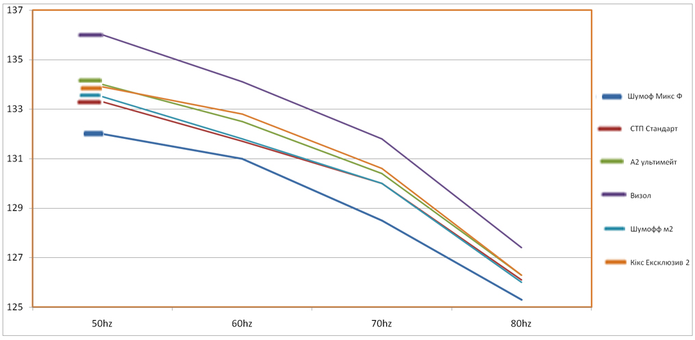 Пока вылаживаю техническую сторону теста, а особенности поклейки и всё остальное, фото - чуть позже. Тестировали на 4 частотах (имитация вибрации, шума брусчатки) - 50,60,70 и 80гц. материал/50/60/70/80/итог Шумоф Микс Ф - 132/131/128,5/125,3/516,8 СТП Бомба - 132,2/131,1/128,6/125,3/517,2 Шумоф м4 - 132,6/131,3/128,6/125,5/518 Кікс Ексклюзив 4 - 132,5/131,6/128,8/125,7/518,6 СТП Супер - 132,6/131,5/129,1/125,8/519 Динамат Екстрим - 132,9/131,3/129,7/125,9/519,8 шумоф м3 - 133/131,6/129,8/125,9/520,3 Шумоф микс - 133,1/131,5/129,8/126/520,4 СТП Стандарт - 133,3/131,7/130/126,1/521,1 СТП МП - 132,5/131,2/130,4/127/521,1 Шумофф м2 - 133,5/131,8/130/126/521,3 СТП Голд - 133,6/132,5/130,3/126,2/522,6 А2 ультимейт - 134/132,5/130,4/126,3/523,2 Кікс Ексклюзив 2 - 133,9/132,8/130,6/126,3/523,6 СТП М2 - 133,8/132,8/130,7/126,4/523,7 Стандарт Ізопласт 2 - 134,1/132,9/130,8/126,5/524,3 А1 Ультимейт - 134,6/133,1/130,6/126,5/524,8 СТП Сильвер - 134,5/132,9/130,9/126,8/525,1 СТП М1 - 134,5/133,1/130,8/126,7/525,1 Стандарт Ізопласт 1,6 - 134,5/133,1/130,9/126,8/525,3 Динамат Динаплейт - 134,8/133,3/130,9/126,6/525,6 Викар ЛТСА 2,3 - 134,3/133,3/131,2/126,9/525,7 АПП дешева чорна - 134,9/133,2/132/127,7/527,8 Викар ЛТСА 1,5 - 135,6/133,8/131,5/127/527,9 Визол - 136/134,1/131,8/127,4/529,3 |