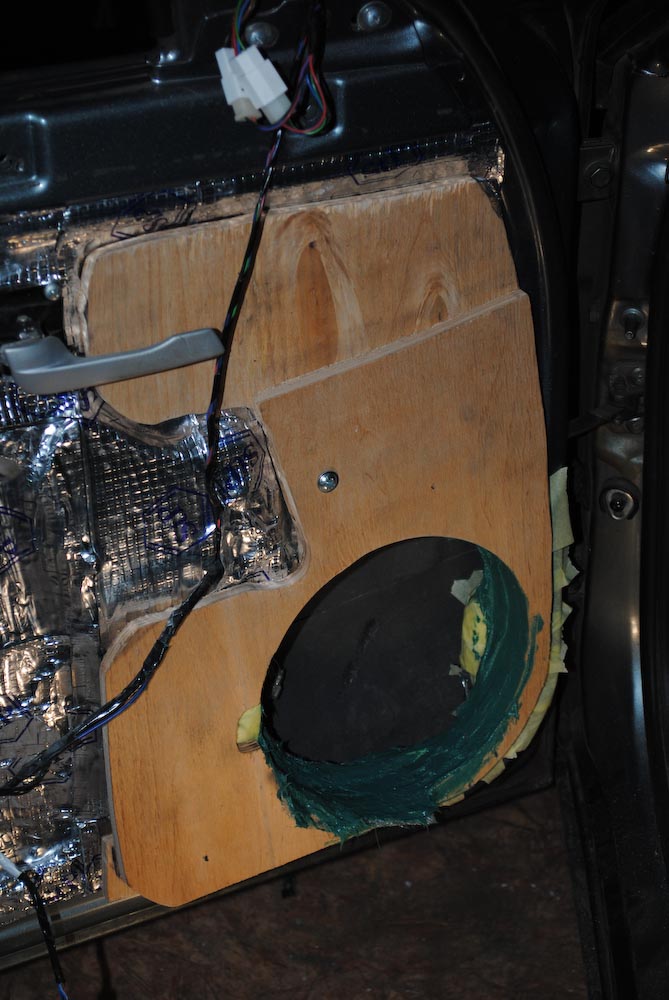 Подиум был сделан из 10 мм фанеры, склеен полиэфиркой и прокручен саморезами, после чего был установлен на двери. просветы между филенкой и подиумом заполнены шпатлевкой со стекловолокном, после высыхания проармирован стекломатом (внутри кольца). дверь предварительно обезшумлена.