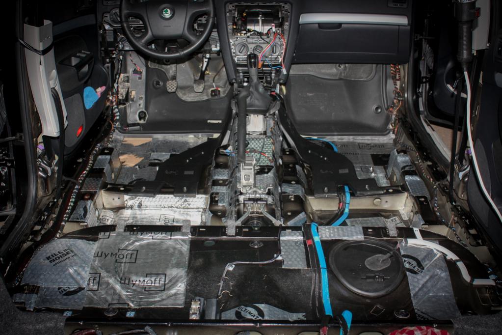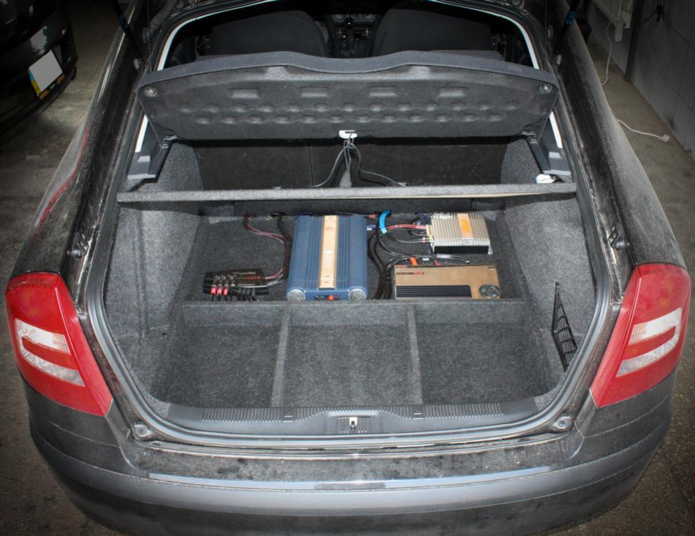 Саб планировал покрасить или заморочиться с карбоном, в общем хотел интересное что-нибудь сделать, в это время как раз мой товарищ музыку устанавливал в октавию, но рестайлинговую (FL). С коробком принципиально не хотел связываться, в итоге уехал мой стелс в другую машину под 12 german maestro.