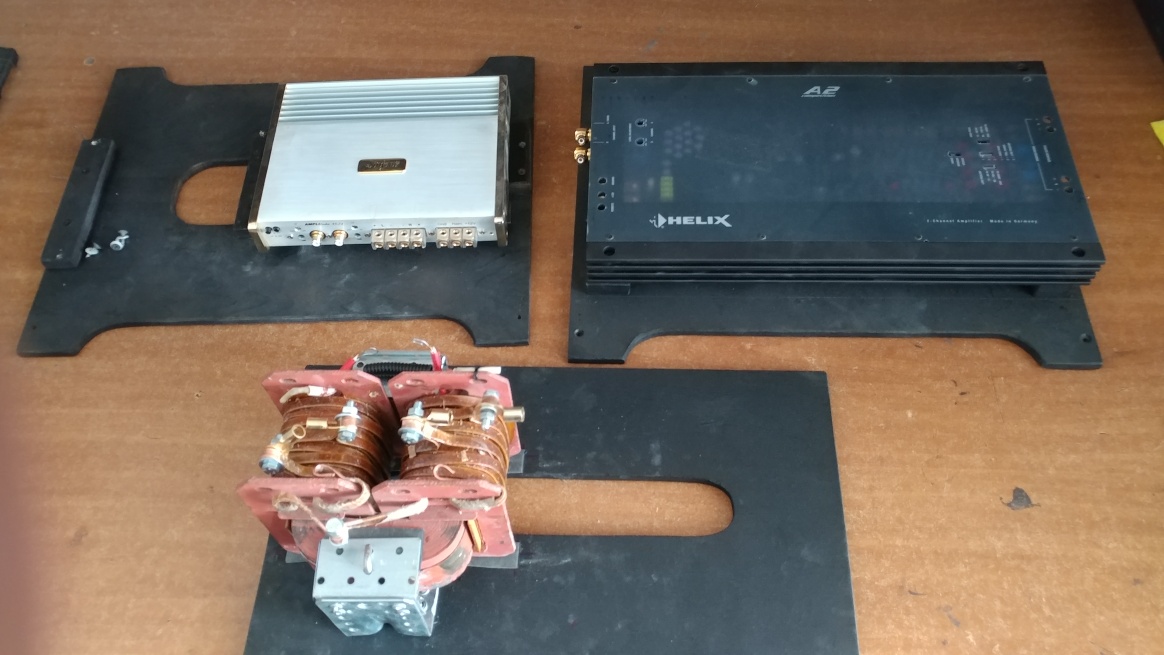 Занялись блоком питания: крепление трансформатора на амортизирующих опорах и через прокладки, мощные отводы по вторичке и др...Проверили его под нагрузкой 4 -мя лампочками , почти 20 А , в течение 1 час....греется слабо, просадка напряжения по переменному току - 0,2В...нормальный транс...Разметили и закрепили основные компоненты: конденсатор, усилители и др...
