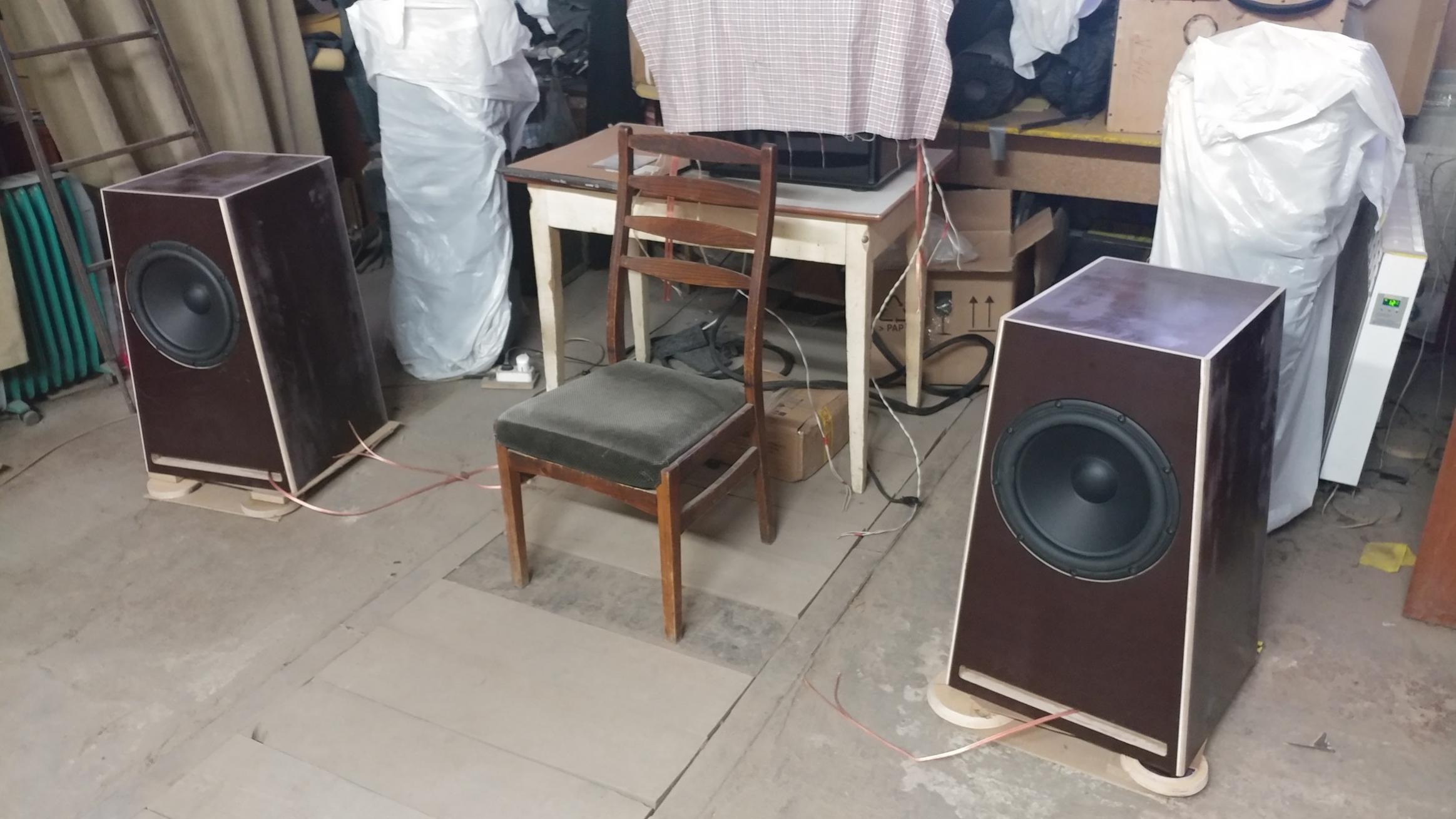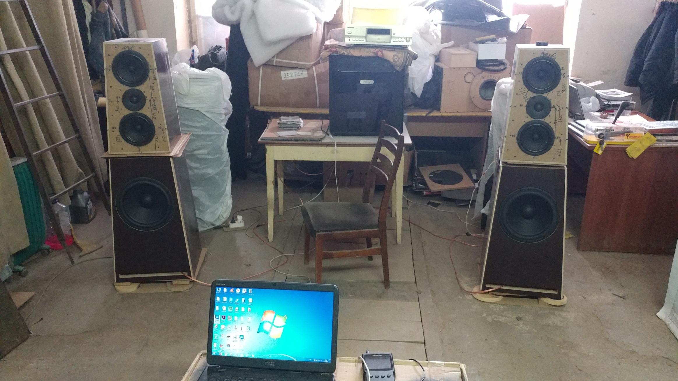 Такие энтузиасты звука, как мы, сегодня работали... Не терпелось поскорее собрать и включится, услышать... Побыстрому собрали акустику, подключились абы какими проводами (видно на фото)))), выставили приблизительно направленность, на картонных прокладках и т.д.... По ходу дела отстроили спектральный баланс и......приступили к прослушиванию. Сравнивали звучание с нашей демо системой, которая недавно на наш слух переиграла в очном прослушивании известный фабричный комплект B&W 804 Nautilus + Classe CAP-151. Итак...: - звучание в 2-3 раза мощнее, громче, без заметных искажений. А если они и имеют место, то от недостаточной мощности наших автоусилителей ( Рном твиттера -130вт, а усилителя -40вт , Рном среднечастотников- 140вт , а усилителя- 30вт, Рном низкочастотника- 350вт, а усилителя - 220вт ). Ну и блок питания на пиковых мощностях пригасает .... А звучит ОЧЕНЬ громко... На расстоянии 1-1,5 м реально чувствуешь всем телом удары мидов и баса, как в очень качественной и мощной автосистеме - нижний бас ОЧЕНЬ глубокий, 30 герцовый длинный пассаж на одном из классических трэков JASCA просто ошеломляет!!! качеством!! и ощущениями!! - звучание ЗАМЕТНО приятней...тембрально, тонально, вовлеченностью!!! минимальными искажениями! Все время хочется....НАВАЛИТЬ! - жанровая универсальность....электронная, классика, джаз, рок и др. звучат ОЧЕНЬ хорошо! Metallica, AC/ DC просто класс!!! - ощущение масштабности, пространства, высокая стабильная сцена, очень хорошие фокусы ( глубина сцены хорошая, но ничем сверх..не выделяется) -.... ну и т.д..... Недостатки есть, конечно, но обсуждать их здесь не буду, это с приглашенными экспертами... Кстати, при больших уровнях громкости и глубоком басе, вибраций на стенках СЧ/ВЧ бокса нет!! на стенках НЧ бокса...очень незначительная... Для себя принял условно оценку качества звучания....10-бальная шкала. Так вот , наша демо система звучит примерно на 4-4,5 баллов, ЭТА примерно на 7,5-8 баллов. А та, которую я слушал у знакомого...на 8,5-9 баллов.Есть к чему стремится, ну и большие резервы есть : акуст.провода, более топовые усилители, переход на домашние усилители и т.д... Все это впереди, испытания, прослушивания, мнения экспертов.... И еще....внешний вид просто радует, даже в далеко незавершенном варианте.. Фундаментальность, очертания, линии,размеры...все соответствует качеству звучания!!! - |