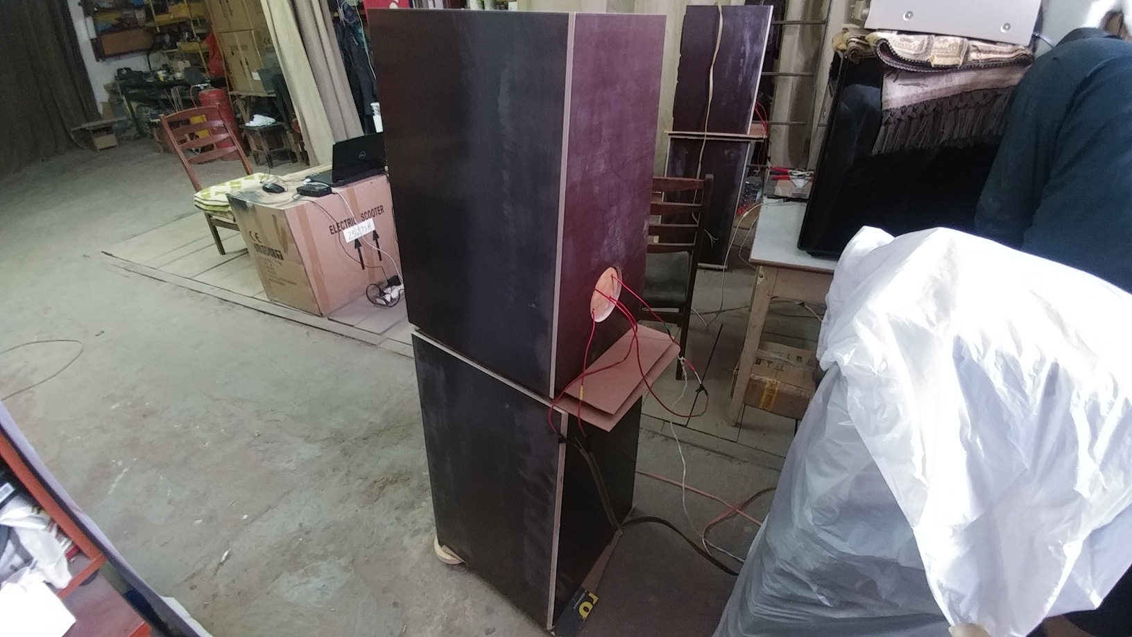 Сегодня ребята отдыхали, а я получил все остальные динамики, не удержался и ....по быстрому их установил в СЧ/ВЧ боксы. Использовал обычные монтажные провода типа МГШВ, подсоединился к блоку усилителей по простому на скрутках..))) НЧ боксы еще сохнут, да я их и сдвинуть с места сам не могу....поэтому установил ВЧ/СЧ боксы на тумбочки, что были под рукой. Задача была прослушать на предмет...работоспособности динамиков.... Задал нужные фильтры, послушал...все нормально, без вопросов.... Ждем НЧ боксы...