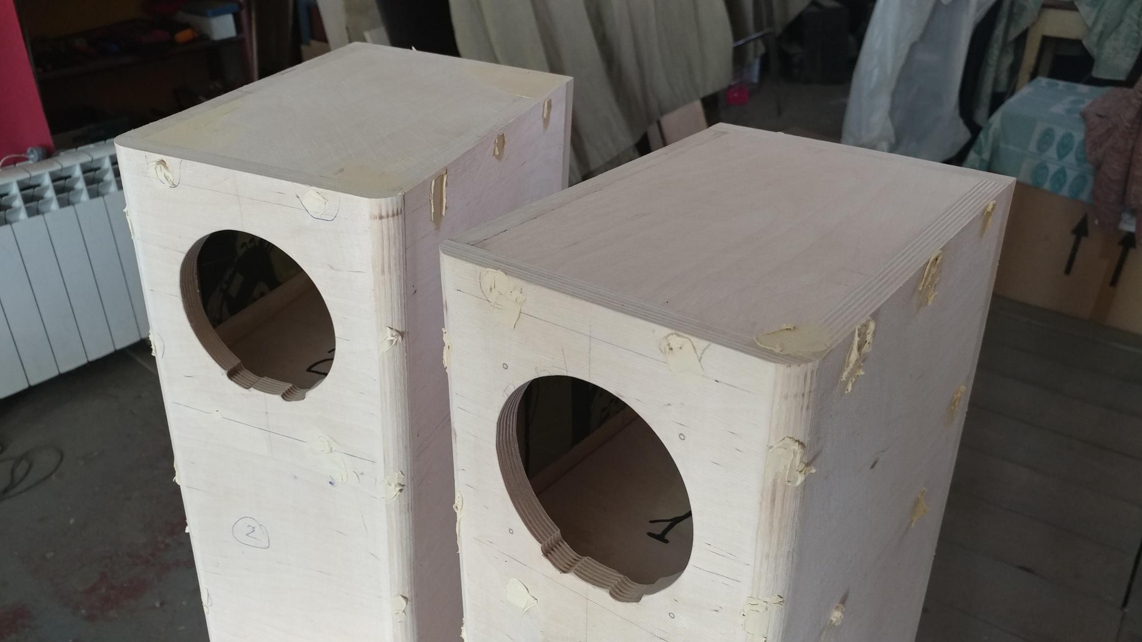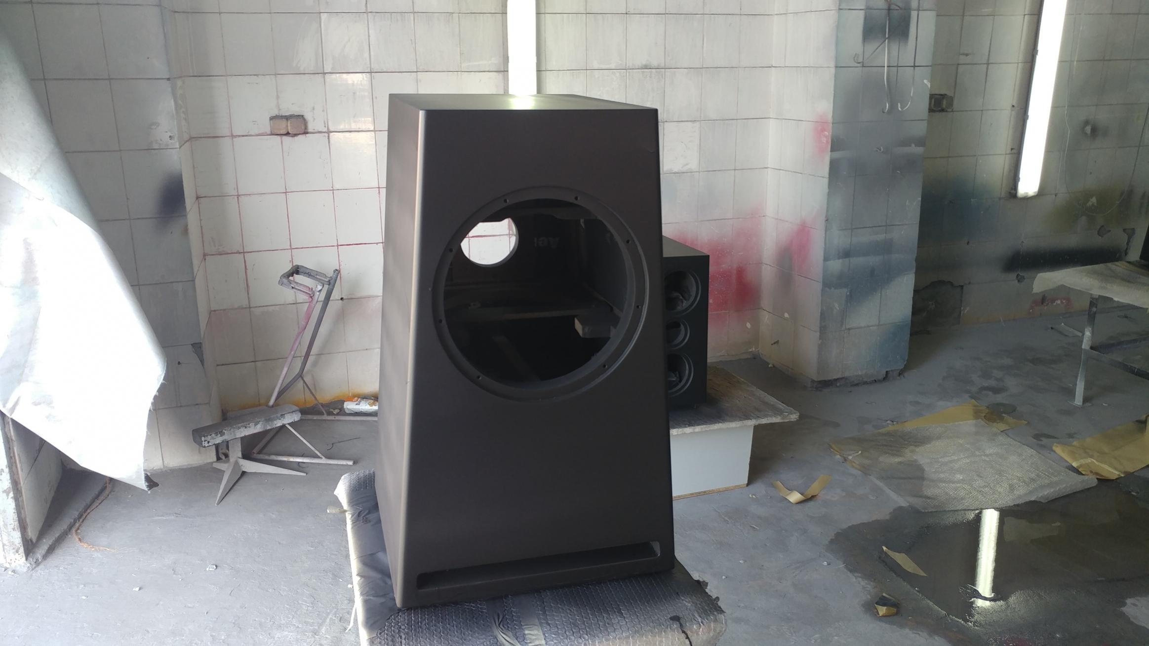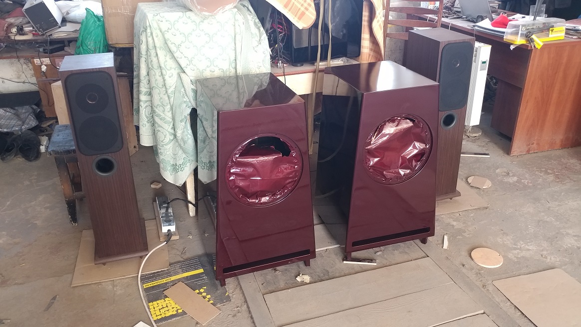 - один корпус ВЧ /СЧ окрашен и покрыт 3 слоями лака, ждет полировки - второй корпус ВЧ / СЧ прогрунтован дважды , отшлифован и готов к покраске и лаку - оба корпуса НЧ первично прогрунтованы Все сохнет.....выдерживаем несколько дней...Никто никуда не спешит!! |