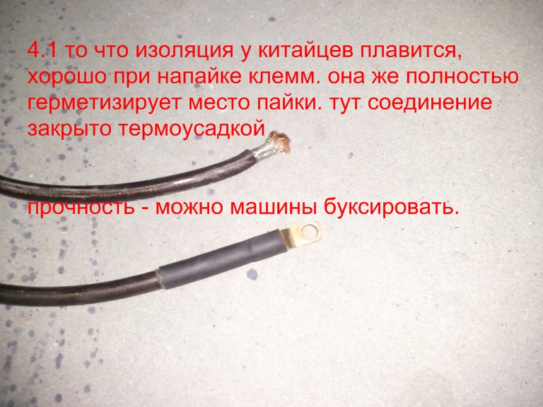 Леша, я не согласен с "4.1" когда раньше паял клемочки, то после демонтажа китайчегов всегда замечал жесткую окисленность в 5-10см рядом с местом пайки... т.е., по предположению, изоляция плавится, пускает кислород... и даже если оно герметично оплавится, что думаю невозможно, кислород все равно свое дело сделает.