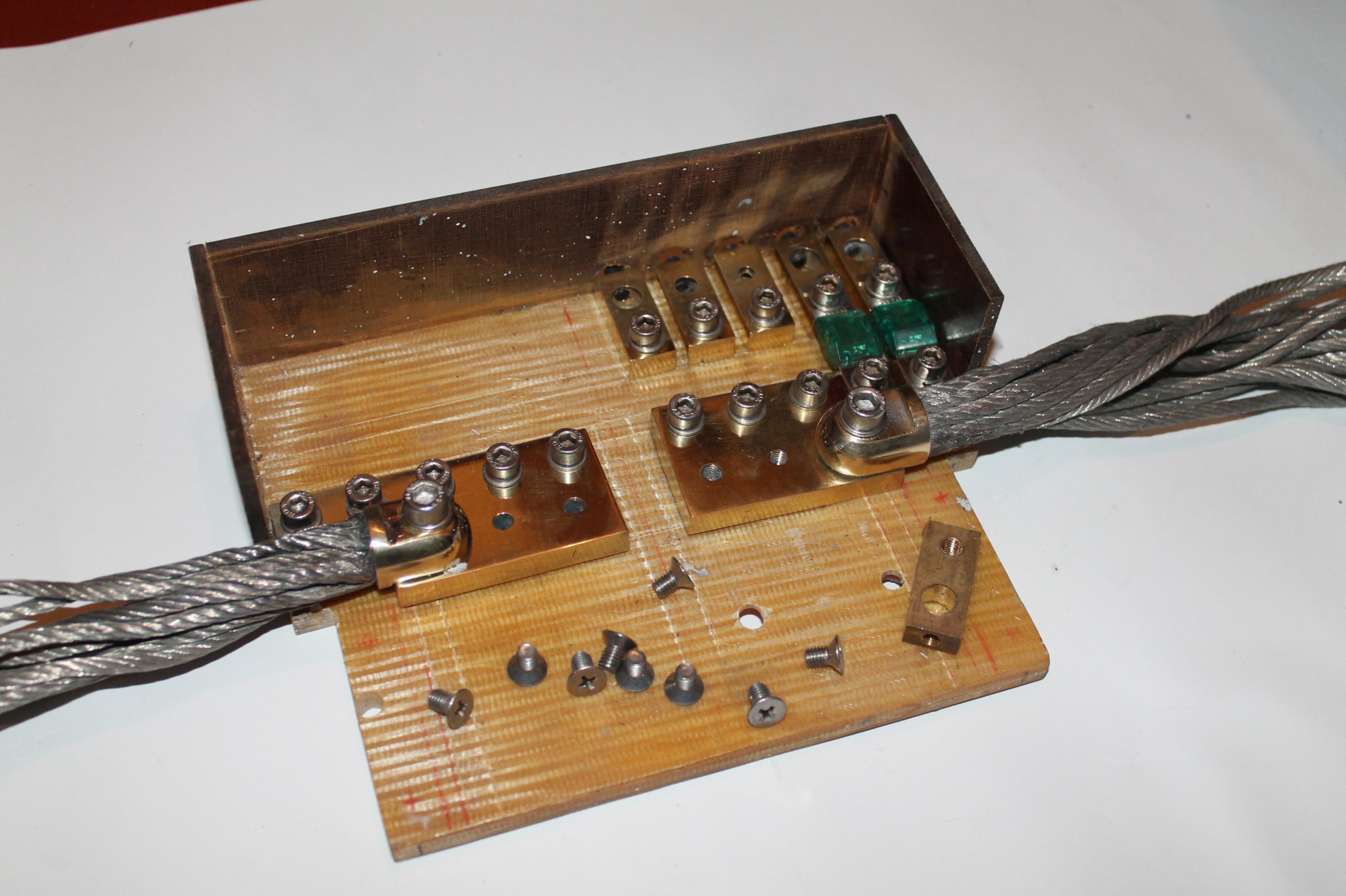 Продам почти готовый самодельный дистрибютор, осталось доделать корпус. Размеры корпуса расчитывались для установки на верх акамулятора 6 СТ 74. Расчитан на подключение пяти потребителей, входные провода около 80 мм2, выходы 3 по 25 мм2, 1 по 10 мм2, 1 по 6 мм2.